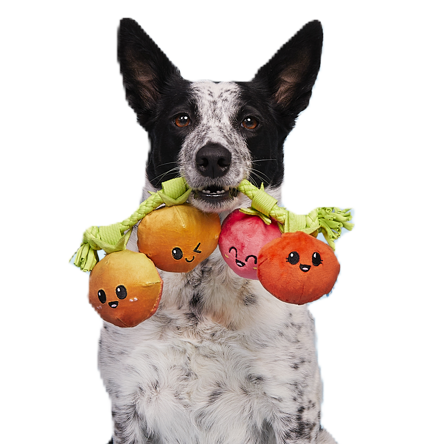 This tomato vine dog toy is ripe for the licking! Each tomato is packed with fluff and a squeaker for your pup to chomp down on. If your dog is feeling saucy, tug on Hairloom Tomatoe's T-Shirt rope vine to cultivate a game of tug-of-war.